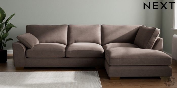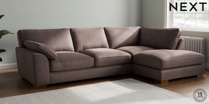 7.3.1 Buy Stamford Grand Relaxed Sit Large Corner Chaise - Right Hand Luxe Chenille Mink Brown Large Square Angle - Brushed Brass from the Next UK online shop Click here to use our accessible website