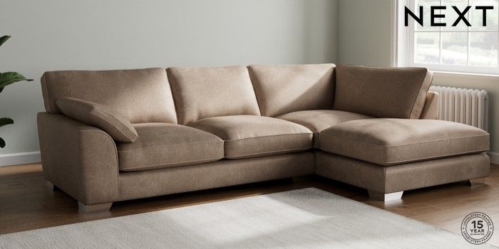 7.3.1 Buy Stamford Grand Relaxed Sit Large Corner Chaise - Right Hand Plush Chenille Mid Natural Large Square Angle - Chrome Metal from the Next UK online shop Click here to use our accessible website