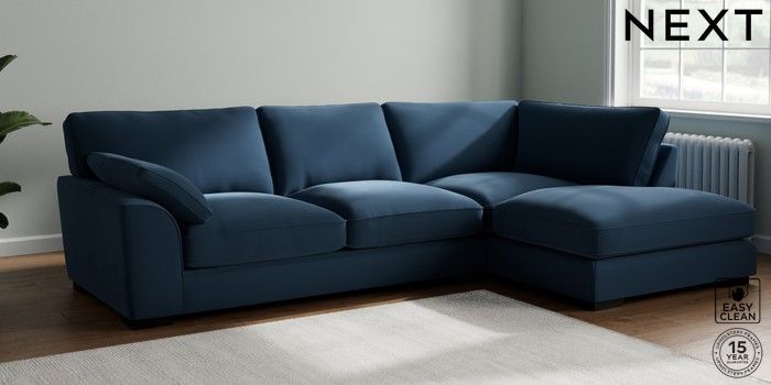 7.3.1 Buy Stamford Grand Relaxed Sit Large Corner Chaise - Right Hand Plush Velvet Easy Clean Airforce Blue Large Square Angle - Dark from the Next UK online shop Click here to use our accessible website