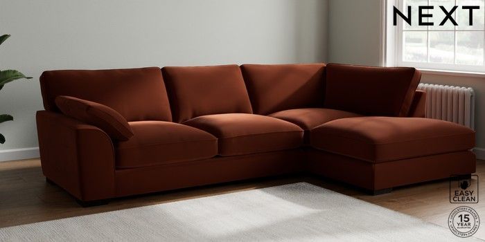 7.3.1 Buy Stamford Grand Relaxed Sit Large Corner Chaise - Right Hand Plush Velvet Easy Clean Ginger Orange Large Square Angle - Dark from the Next UK online shop Click here to use our accessible website