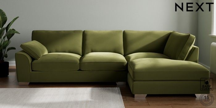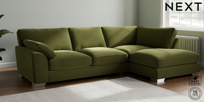 7.3.1 Buy Stamford Grand Relaxed Sit Large Corner Chaise - Right Hand Plush Velvet Easy Clean Mid Olive Green Large Square Angle - Chrome Metal from the Next UK online shop