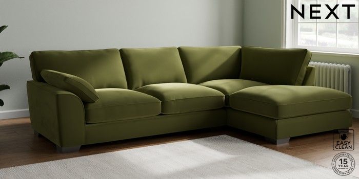 7.3.1 Buy Stamford Grand Relaxed Sit Large Corner Chaise - Right Hand Plush Velvet Easy Clean Mid Olive Green Large Square Angle - Gunmetal from the Next UK online shop