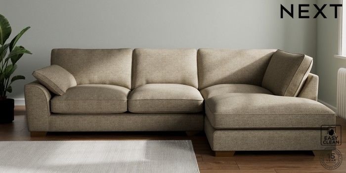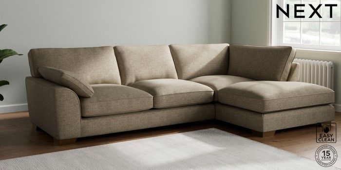 7.3.1 Buy Stamford Grand Relaxed Sit Large Corner Chaise - Right Hand Woven Chenille Easy Clean Mid Natural Large Square Angle - Brushed Brass from the Next UK online shop Click here to use our accessible website