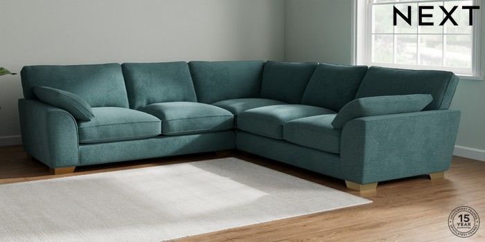7.3.1 Buy Stamford Grand Relaxed Sit Large Corner Sofa - Universal Chunky Chenille Mid Teal Green Large Square Angle - Brushed Brass from the Next UK online shop Click here to use our accessible website