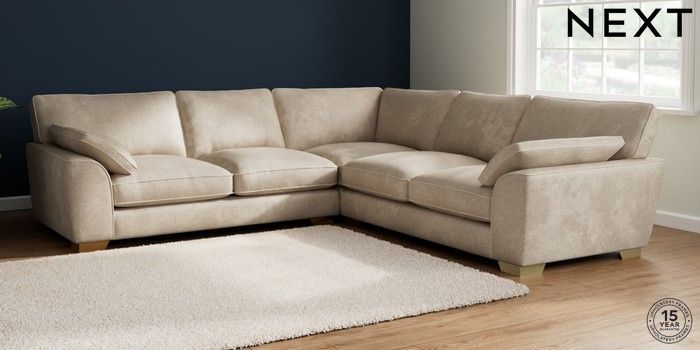 7.2.10 Buy Stamford Grand Relaxed Sit Large Corner Sofa - Universal Plush Chenille Light Natural Large Square Angle - Brushed Brass from the Next UK online shop Click here to use our accessible website