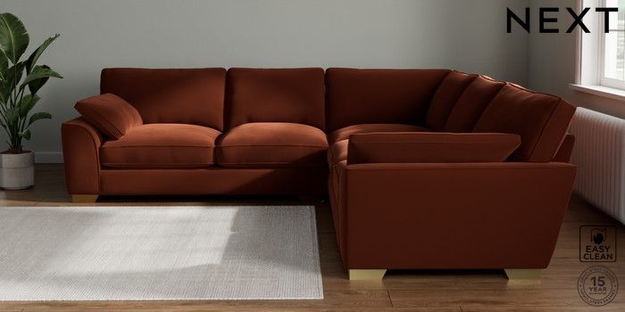 7.3.1 Buy Stamford Grand Relaxed Sit Large Corner Sofa - Universal Plush Velvet Easy Clean Ginger Orange Large Square Angle - Brushed Brass from the Next UK online shop Click here to use our accessible website