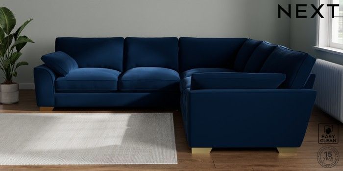 7.3.1 Buy Stamford Grand Relaxed Sit Large Corner Sofa - Universal Plush Velvet Easy Clean Navy Blue Large Square Angle - Brushed Brass from the Next UK online shop Click here to use our accessible website