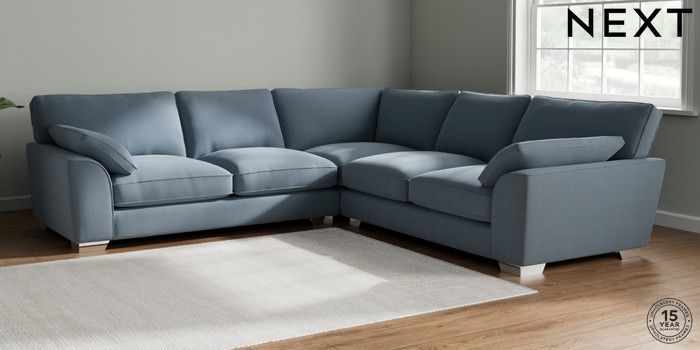 7.3.1 Buy Stamford Grand Relaxed Sit Large Corner Sofa - Universal Relaxed Linen Look Mid Blue Large Square Angle - Chrome Metal from the Next UK online shop Click here to use our accessible website