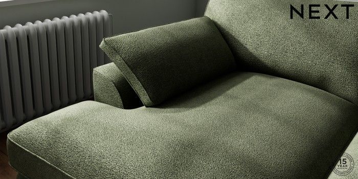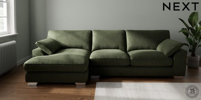7.3.1 Buy Stamford Grand Relaxed Sit Large Sofa Chaise - Left Hand Boucle Chenille Dark Moss Green Large Square Angle - Chrome Metal from the Next UK online shop Click here to use our accessible website