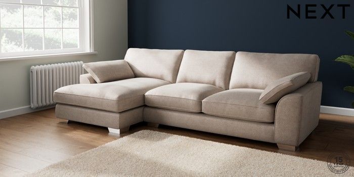 7.3.1 Buy Stamford Grand Relaxed Sit Large Sofa Chaise - Left Hand Boucle Chenille Light Natural Large Square Angle - Chrome Metal from the Next UK online shop Click here to use our accessible website