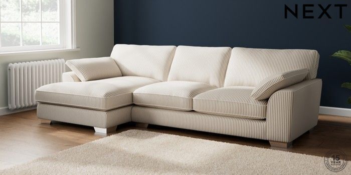 7.2.10 Buy Stamford Grand Relaxed Sit Large Sofa Chaise - Left Hand Chenille Stripe Natural Large Square Angle - Chrome Metal from the Next UK online shop Click here to use our accessible website