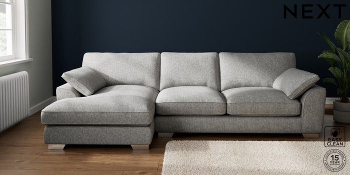 7.3.1 Buy Stamford Grand Relaxed Sit Large Sofa Chaise - Left Hand Chunky Boucle Easy Clean Light Grey Large Square Angle - Chrome Metal from the Next UK online shop Click here to use our accessible website