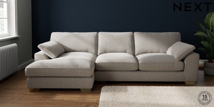 7.3.1 Buy Stamford Grand Relaxed Sit Large Sofa Chaise - Left Hand Chunky Weave Dove Grey Large Square Angle - Brushed Brass from the Next UK online shop Click here to use our accessible website