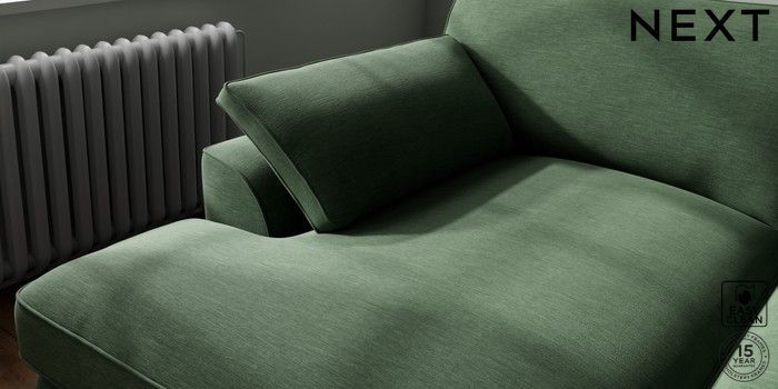 7.3.1 Buy Stamford Grand Relaxed Sit Large Sofa Chaise - Left Hand Fine Chenille Easy Clean Mid Khaki Green Large Square Angle - Brushed Brass from the Next UK online shop Click here to use our accessible website