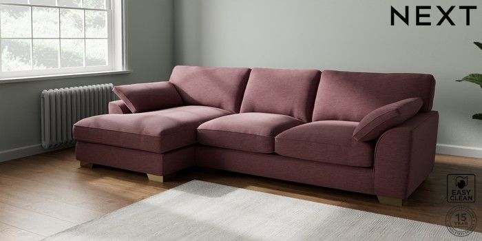 7.3.1 Buy Stamford Grand Relaxed Sit Large Sofa Chaise - Left Hand Fine Chenille Easy Clean Mid Mulberry Purple Large Square Angle - Brushed Brass from the Next UK online shop Click here to use our accessible website