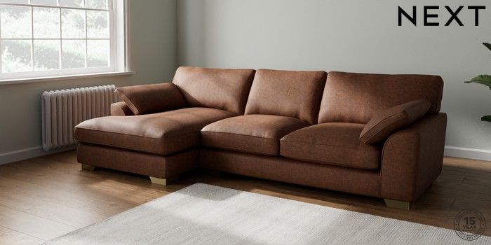 7.3.1 Buy Stamford Grand Relaxed Sit Large Sofa Chaise - Left Hand Monza Faux Leather Easy Clean Chestnut Brown Large Square Angle - Brushed Brass from the Next UK online shop Click here to use our accessible website