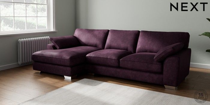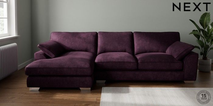 7.3.1 Buy Stamford Grand Relaxed Sit Large Sofa Chaise - Left Hand Plush Chenille Dark Plum Purple Large Square Angle - Chrome Metal from the Next UK online shop Click here to use our accessible website