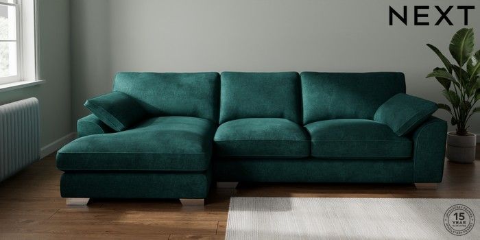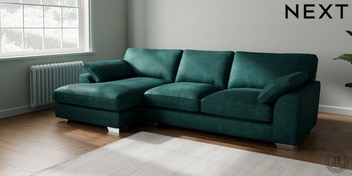7.3.1 Buy Stamford Grand Relaxed Sit Large Sofa Chaise - Left Hand Plush Chenille Dark Teal Green Large Square Angle - Chrome Metal from the Next UK online shop Click here to use our accessible website