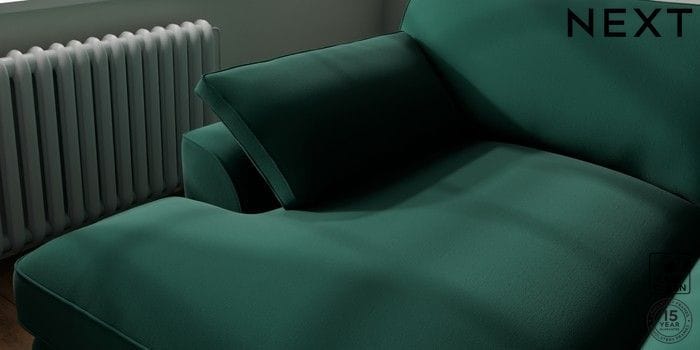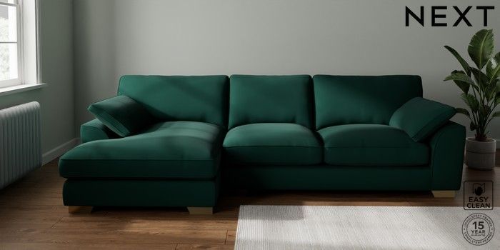 7.3.1 Buy Stamford Grand Relaxed Sit Large Sofa Chaise - Left Hand Plush Velvet Easy Clean Bottle Green Large Square Angle - Brushed Brass from the Next UK online shop Click here to use our accessible website