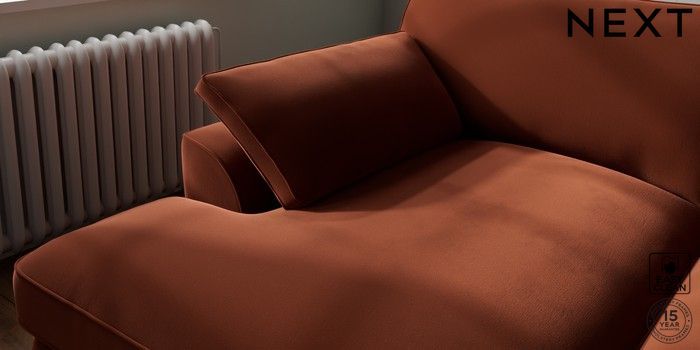 7.3.1 Buy Stamford Grand Relaxed Sit Large Sofa Chaise - Left Hand Plush Velvet Easy Clean Ginger Orange Large Square Angle - Brushed Brass from the Next UK online shop Click here to use our accessible website