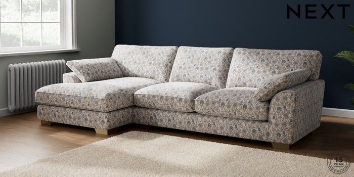 7.2.10 Buy Stamford Grand Relaxed Sit Large Sofa Chaise - Left Hand Relaxed Linen Look Print Woodblock Floral Blue Large Square Angle - Brushed Brass from the Next UK online shop Click here to use our accessible website