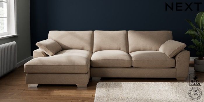 7.3.1 Buy Stamford Grand Relaxed Sit Large Sofa Chaise - Left Hand Tweedy Blend Easy Clean Light Dove Natural Large Square Angle - Chrome Metal from the Next UK online shop Click here to use our accessible website