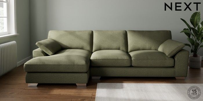 7.3.1 Buy Stamford Grand Relaxed Sit Large Sofa Chaise - Left Hand Tweedy Chenille Mid Moss Green Large Square Angle - Chrome Metal from the Next UK online shop Click here to use our accessible website