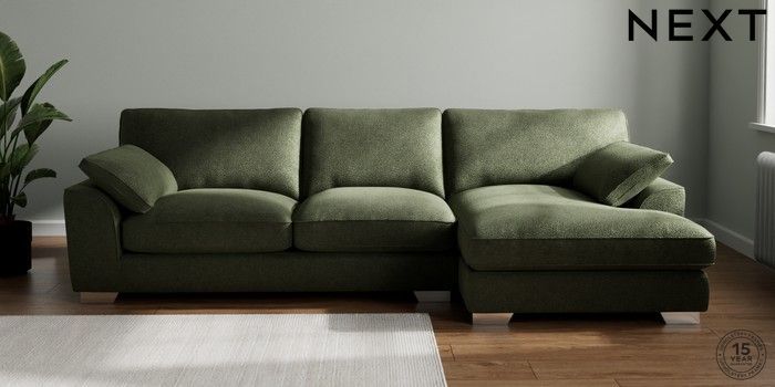 7.3.1 Buy Stamford Grand Relaxed Sit Large Sofa Chaise - Right Hand Boucle Chenille Dark Moss Green Large Square Angle - Chrome Metal from the Next UK online shop Click here to use our accessible website