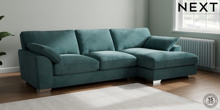 7.3.1 Buy Stamford Grand Relaxed Sit Large Sofa Chaise - Right Hand Chunky Chenille Mid Teal Green Large Square Angle - Chrome Metal from the Next UK online shop Click here to use our accessible website