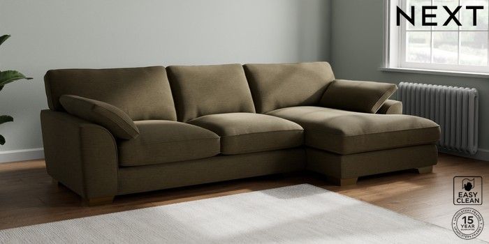 7.3.1 Buy Stamford Grand Relaxed Sit Large Sofa Chaise - Right Hand Fine Chenille Easy Clean Dark Moss Green Large Square Angle - Brushed Brass from the Next UK online shop Click here to use our accessible website