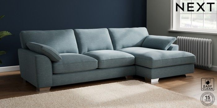 7.3.1 Buy Stamford Grand Relaxed Sit Large Sofa Chaise - Right Hand Fine Chenille Easy Clean Mid Blue Large Square Angle - Chrome Metal from the Next UK online shop Click here to use our accessible website