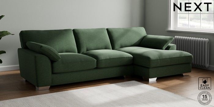 7.3.1 Buy Stamford Grand Relaxed Sit Large Sofa Chaise - Right Hand Fine Chenille Easy Clean Mid Khaki Green Large Square Angle - Chrome Metal from the Next UK online shop Click here to use our accessible website
