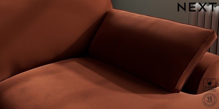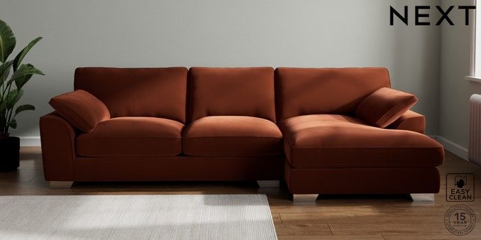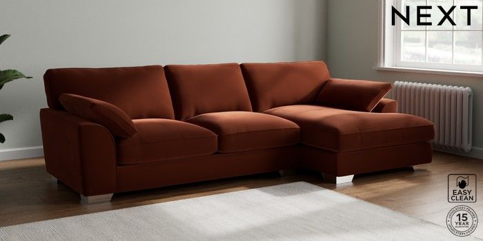 7.3.1 Buy Stamford Grand Relaxed Sit Large Sofa Chaise - Right Hand Plush Velvet Easy Clean Ginger Orange Large Square Angle - Chrome Metal from the Next UK online shop Click here to use our accessible website