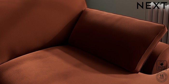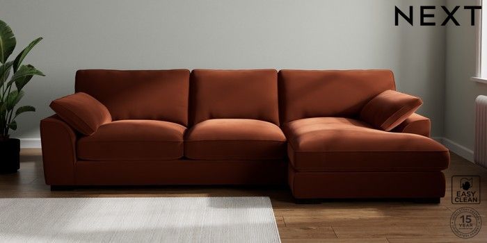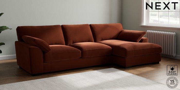 7.3.1 Buy Stamford Grand Relaxed Sit Large Sofa Chaise - Right Hand Plush Velvet Easy Clean Ginger Orange Large Square Angle - Dark from the Next UK online shop Click here to use our accessible website