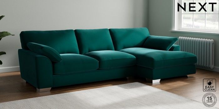 7.3.1 Buy Stamford Grand Relaxed Sit Large Sofa Chaise - Right Hand Plush Velvet Easy Clean Juniper Green Large Square Angle - Chrome Metal from the Next UK online shop Click here to use our accessible website