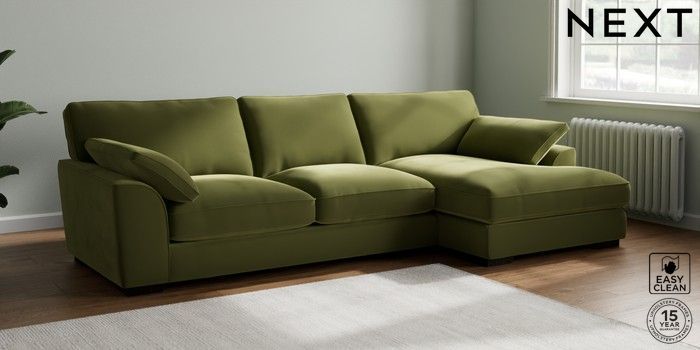 7.3.1 Buy Stamford Grand Relaxed Sit Large Sofa Chaise - Right Hand Plush Velvet Easy Clean Mid Olive Green Large Square Angle - Dark from the Next UK online shop Click here to use our accessible website