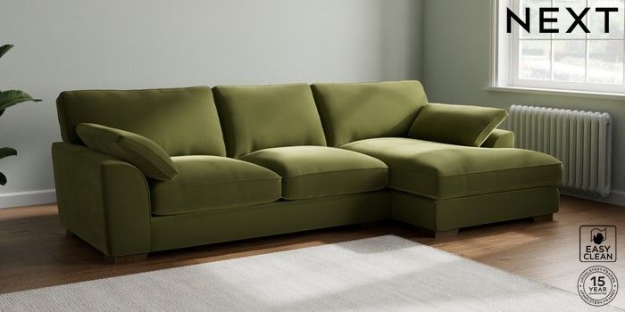 7.3.1 Buy Stamford Grand Relaxed Sit Large Sofa Chaise - Right Hand Plush Velvet Easy Clean Mid Olive Green Large Square Angle - Mid from the Next UK online shop Click here to use our accessible website