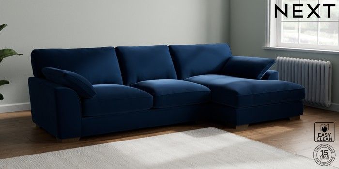7.3.1 Buy Stamford Grand Relaxed Sit Large Sofa Chaise - Right Hand Plush Velvet Easy Clean Navy Blue Large Square Angle - Mid from the Next UK online shop Click here to use our accessible website