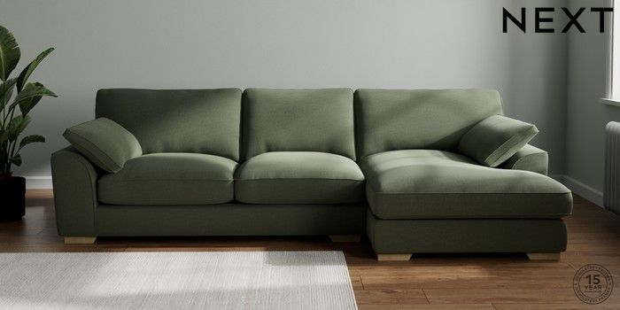 7.3.1 Buy Stamford Grand Relaxed Sit Large Sofa Chaise - Right Hand Relaxed Linen Look Dark Green Large Square Angle - Light from the Next UK online shop Click here to use our accessible website