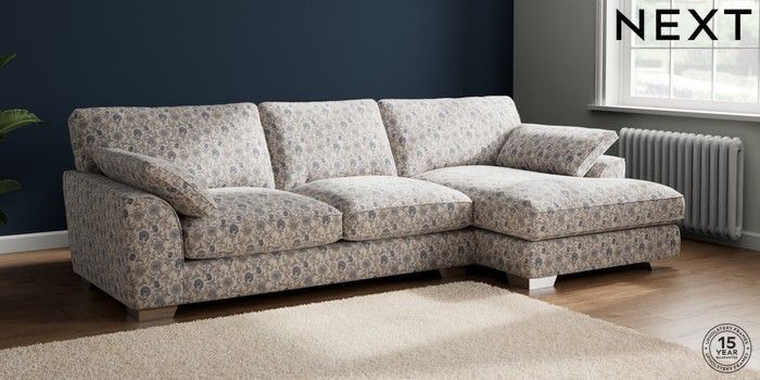 7.2.10 Buy Stamford Grand Relaxed Sit Large Sofa Chaise - Right Hand Relaxed Linen Look Print Woodblock Floral Blue Large Square Angle - Chrome Metal from the Next UK online shop Click here to use our accessible website