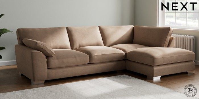 7.2.10 Buy Stamford Grand Relaxed Sit Large Corner Chaise - Right Hand Luxe Chenille Mid Natural Large Square Angle - Chrome Metal from the Next UK online shop Click here to use our accessible website