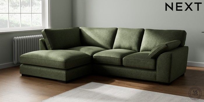 7.2.10 Buy Stamford Grand Relaxed Sit Medium Corner Chaise - Left Hand Boucle Chenille Dark Moss Green Large Square Angle - Dark from the Next UK online shop Click here to use our accessible website