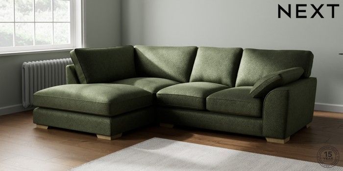 7.2.10 Buy Stamford Grand Relaxed Sit Medium Corner Chaise - Left Hand Boucle Chenille Dark Moss Green Large Square Angle - Light from the Next UK online shop Click here to use our accessible website