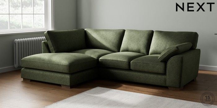 7.2.10 Buy Stamford Grand Relaxed Sit Medium Corner Chaise - Left Hand Boucle Chenille Dark Moss Green Large Square Angle - Mid from the Next UK online shop Click here to use our accessible website