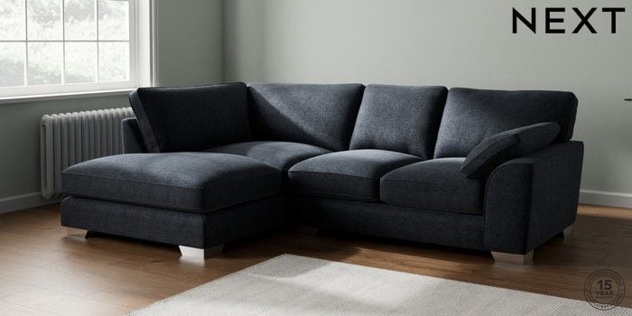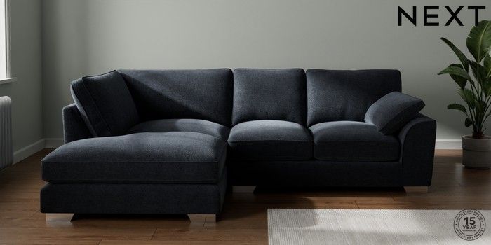 7.3.1 Buy Stamford Grand Relaxed Sit Medium Corner Chaise - Left Hand Boucle Chenille Dark Slate Blue Large Square Angle - Chrome Metal from the Next UK online shop Click here to use our accessible website