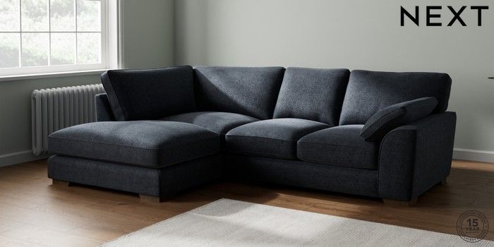7.2.10 Buy Stamford Grand Relaxed Sit Medium Corner Chaise - Left Hand Boucle Chenille Dark Slate Blue Large Square Angle - Mid from the Next UK online shop Click here to use our accessible website