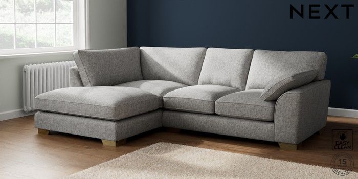 7.2.10 Buy Stamford Grand Relaxed Sit Medium Corner Chaise - Left Hand Chunky Boucle Easy Clean Light Grey Large Square Angle - Brushed Brass from the Next UK online shop Click here to use our accessible website