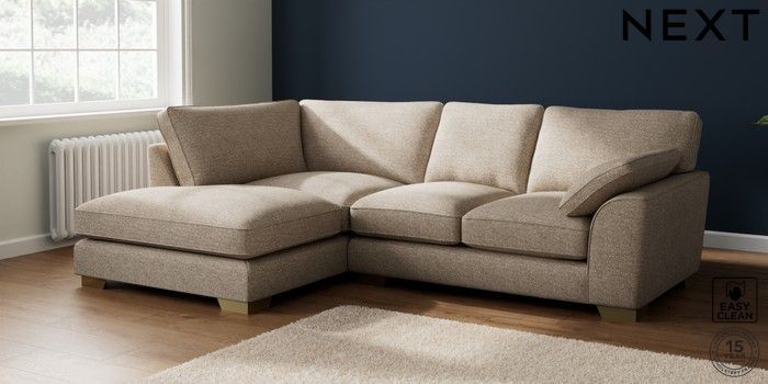 7.3.1 Buy Stamford Grand Relaxed Sit Medium Corner Chaise - Left Hand Chunky Boucle Easy Clean Mid Natural Large Square Angle - Brushed Brass from the Next UK online shop Click here to use our accessible website