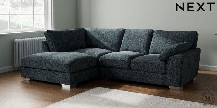 7.3.1 Buy Stamford Grand Relaxed Sit Medium Corner Chaise - Left Hand Chunky Chenille Dark Navy Blue Large Square Angle - Chrome Metal from the Next UK online shop Click here to use our accessible website