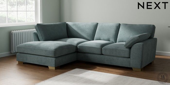 7.2.10 Buy Stamford Grand Relaxed Sit Medium Corner Chaise - Left Hand Chunky Chenille Light Teal Green Large Square Angle - Brushed Brass from the Next UK online shop Click here to use our accessible website